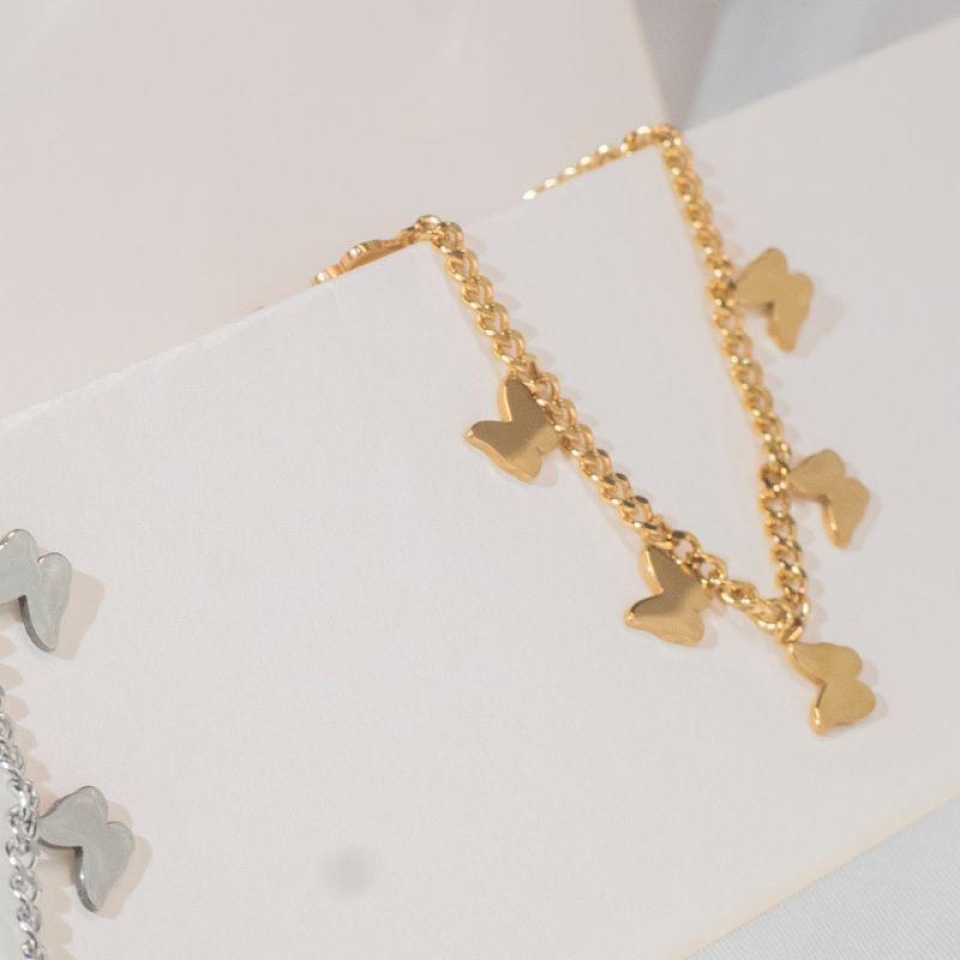 Essa pulseira de aço inoxidável traz um toque delicado e moderno com seus pingentes de borboleta, símbolo de transformação e liberdade.