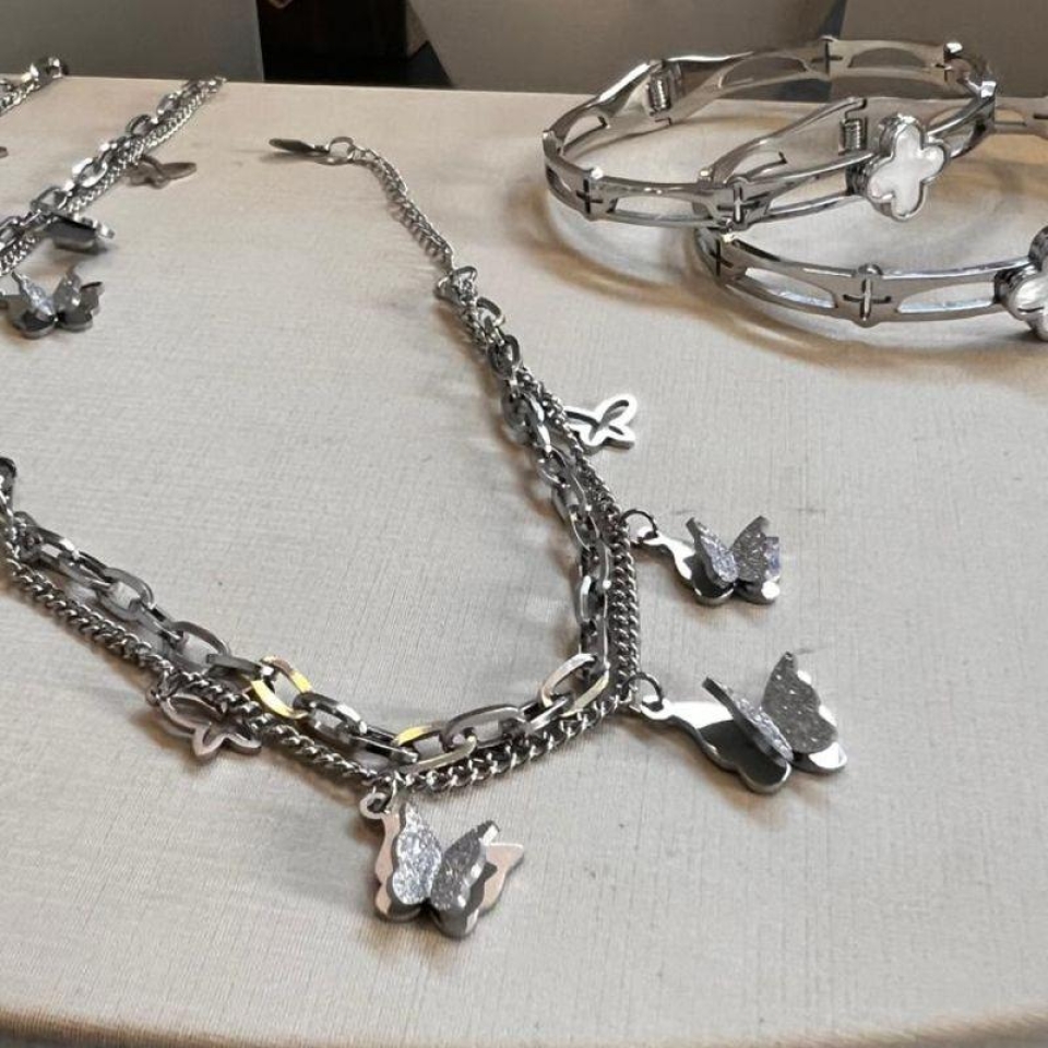 Pulseira em aço inox com banho de ouro, dupla com pingentes de borboleta fosca.
